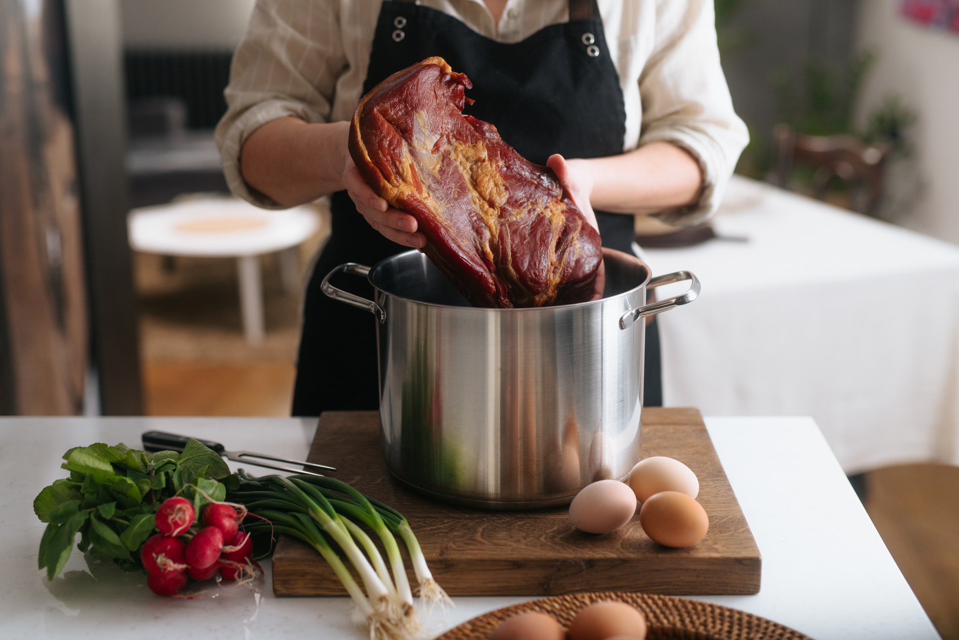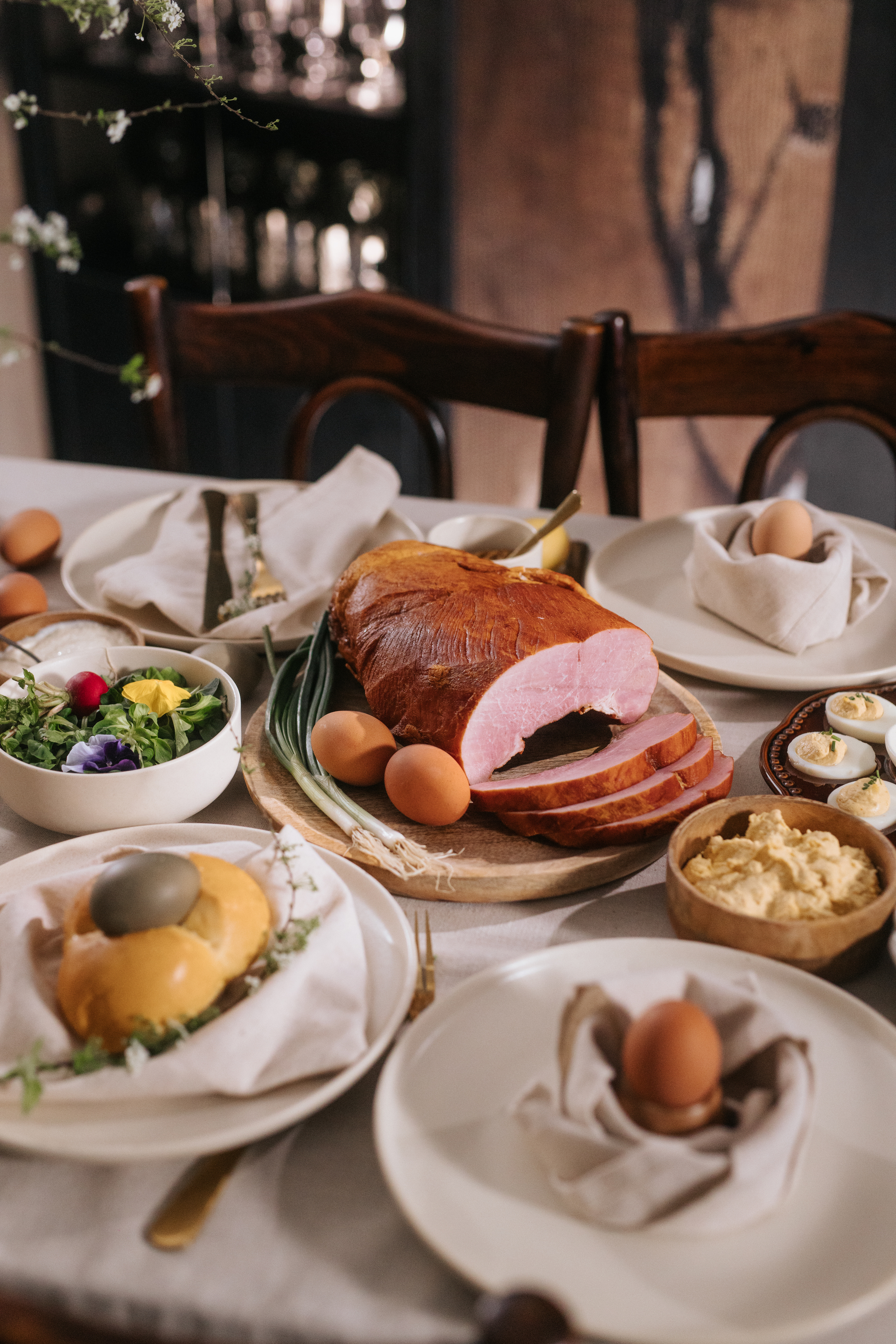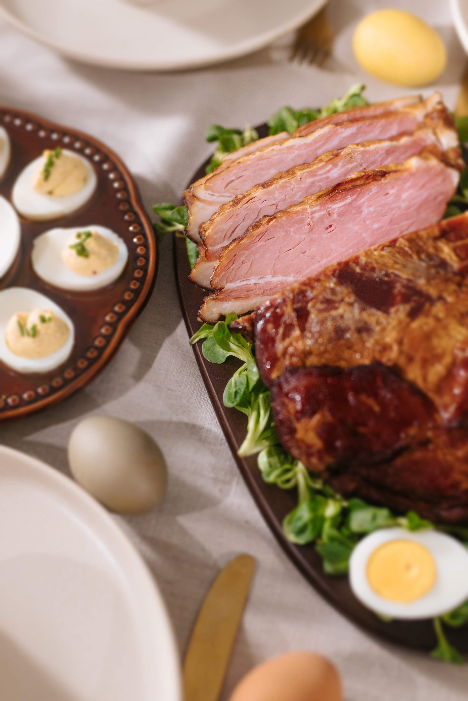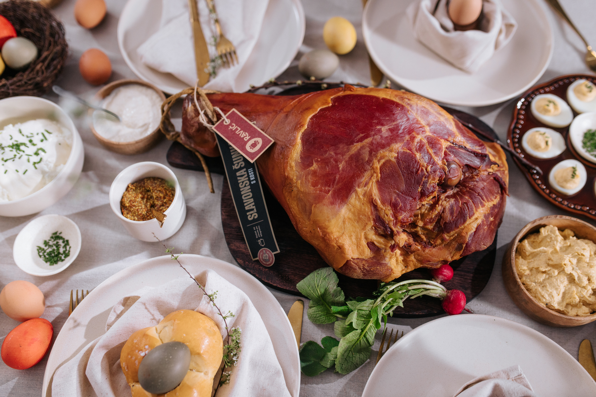 Uz šunku, uskrsni stol obogatite hrenom s vrhnjem, mladim salatama, svježim sirom s vrhnjem i vlascem, zrnatim senfom, punjenim jajima, mladim lukom i rotkvicama. Tako pripremljen stol bit će raskošan, svjež i u pravom blagdanskom duhu.